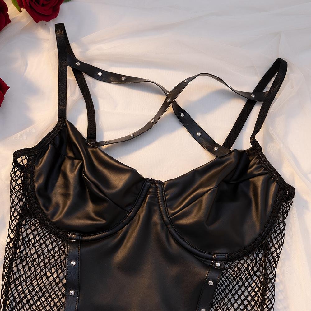 Femgrace Nighty Beautiful Bridal Made Popular New Lace Mesh Halter V-neck Black Leather Wear Hollow Teddy Suit